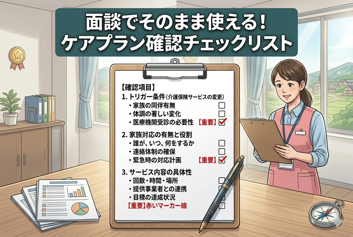 この記事を読み終えたら、まずは今のケアプラン(または原案)を見直し、次の3点をケアマネジャーに確認してみてください。